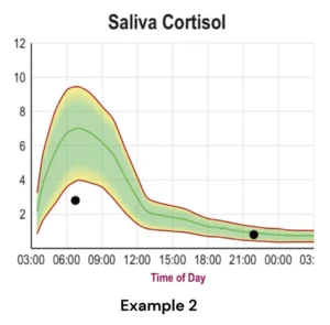 Another patient was experiencing similar symptoms to patient 1, however, there was a significant difference in how their body was responding to stress. As you can see in the graph, her two testing points show she was in a decreased cortisol state which can manifest as fatigue or exhaustion, poor stress tolerance, irritability, salt or sugar cravings, and body aches and pains. It is unclear from this initial testing if she had been experiencing cortisol deficiency or if this was a presentation of adrenal fatigue where she had been functioning in an elevated cortisol state for long enough that her adrenal glands fatigue. Treatment for her cortisol levels also included adaptogens and herbs to balance her cortisol levels.